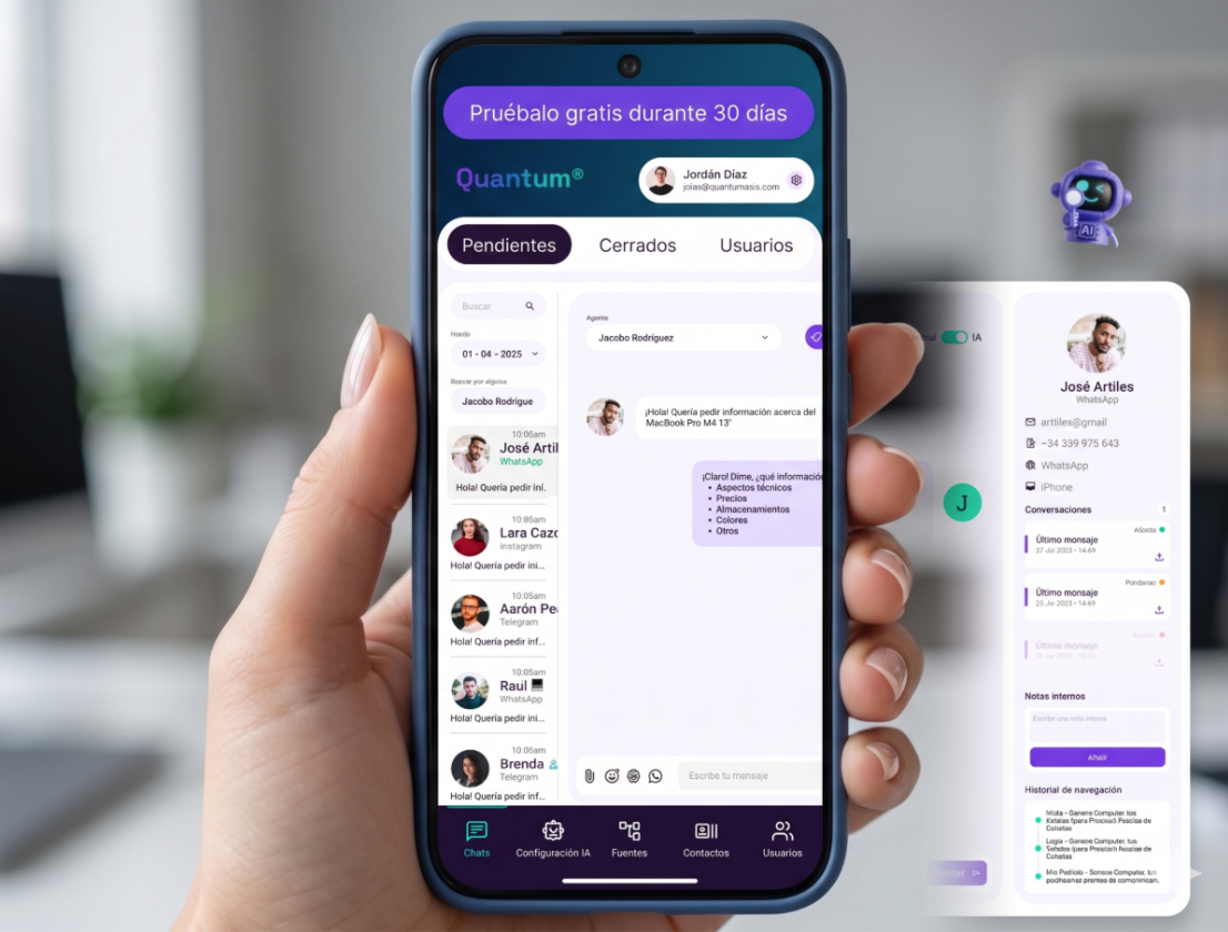 QuantumAsis llega para unificar este caos. Un solo panel WhatsApp, Instagram y tu web hablan el mismo idioma que tu CRM y ERP.